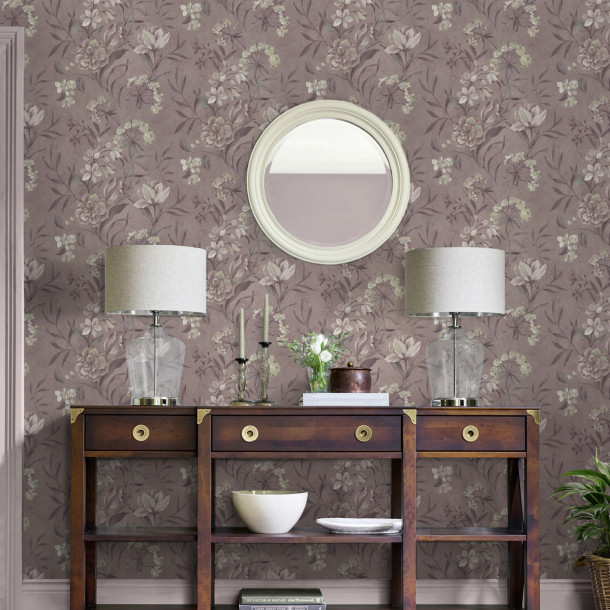 Grape-toned floral wallpaper with trailing flowers on a textured background. Elegant and artistic.