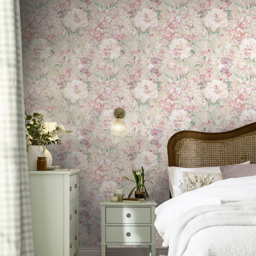 Soft pink wallpaper with large hand-painted flowers. Inspired by English gardens, adds elegance and freshness.