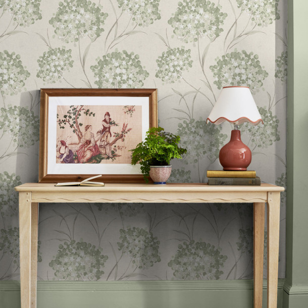 Wallpaper with fresh green allium flowers on curling stems. Natural and fresh, perfect for any space.