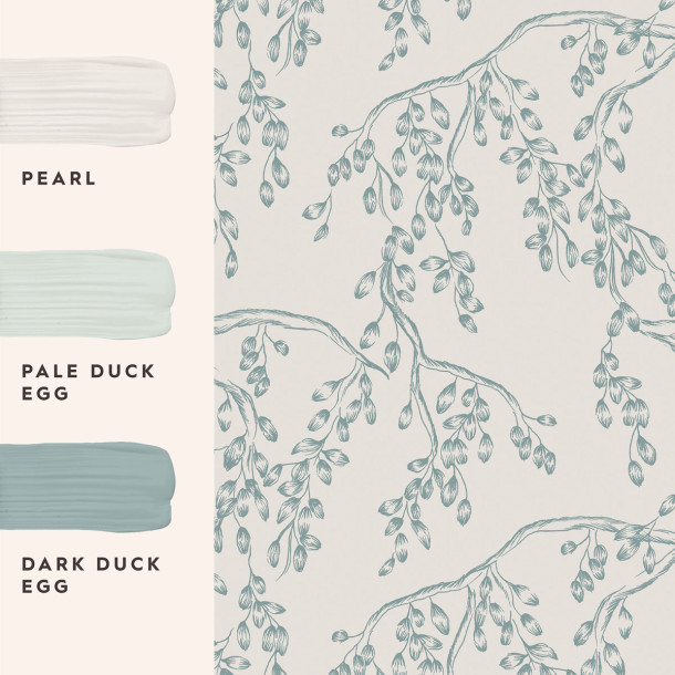 Soft blue wallpaper with delicate stems and leaves. Brings calm and natural elegance to any room.