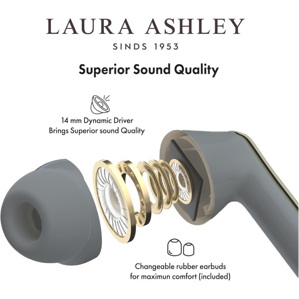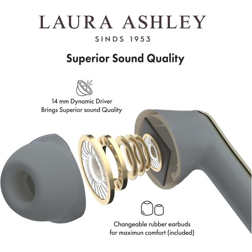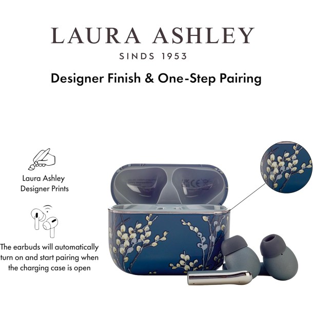 VQ Skylark wireless earbuds with Bluetooth 5.3 offer quick pairing and up to 10m range. Enjoy Hi-Fi sound with deep bass, rich mids and clear treble, plus an HD mic for crystal-clear calls. The Laura Ashley charging case adds chic style and up to 45h of extra battery life. Each earbud charge lasts 10h playtime and 200h standby. Includes 3 interchangeable ear tips for a perfect fit. Lightweight, stylish 2023 Laura Ashley design.