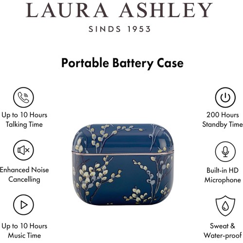 Pussy Willow VQ Skylark wireless earbuds with Bluetooth 5.3, Hi-Fi sound and HD mic. Up to 10h battery life plus stylish Laura Ashley charging case. Perfect for music, podcasts or calls with comfort and chic design.