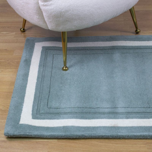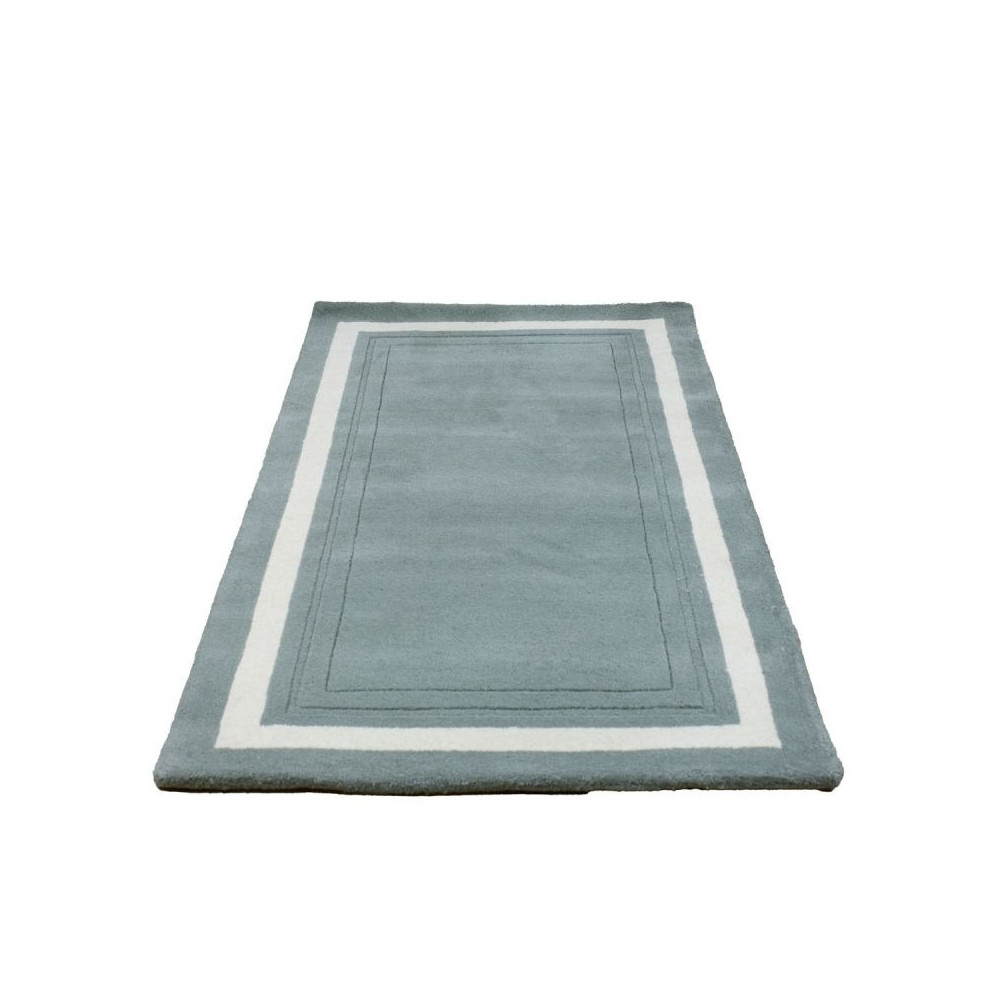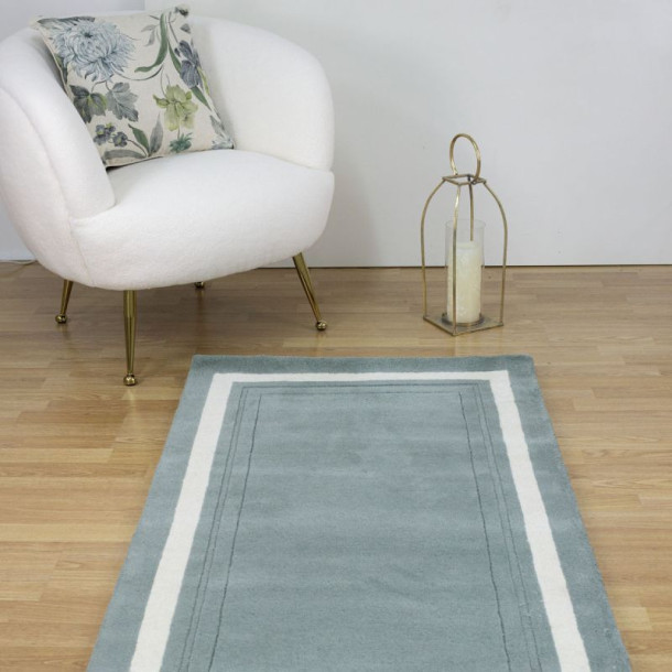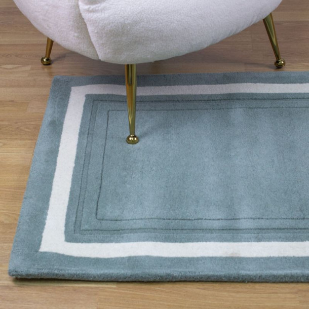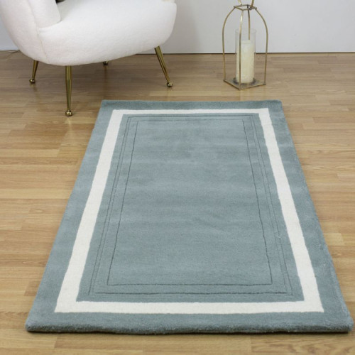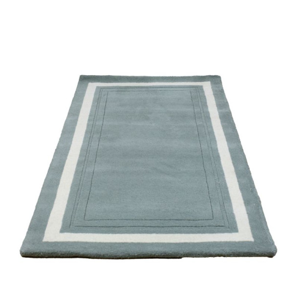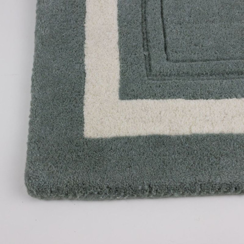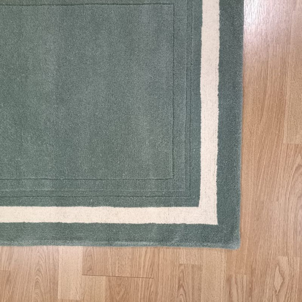 Alfombra de lana natural, de color Verde Helecho, con diseño clásico de cenefa central contrastada en color neutro.