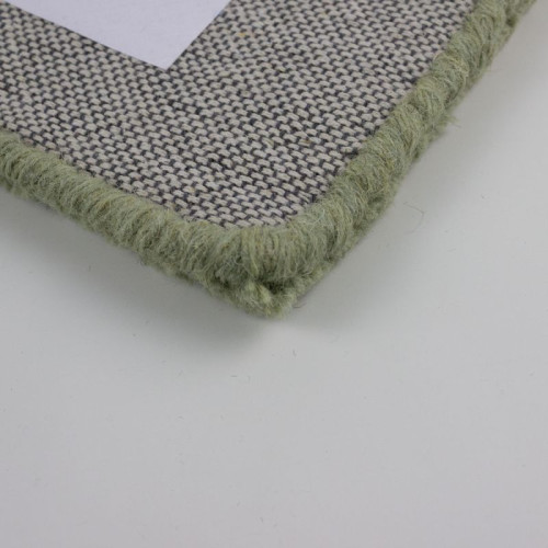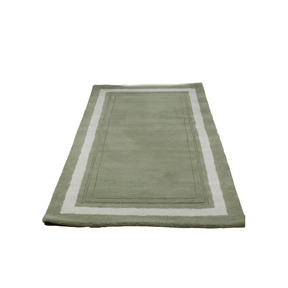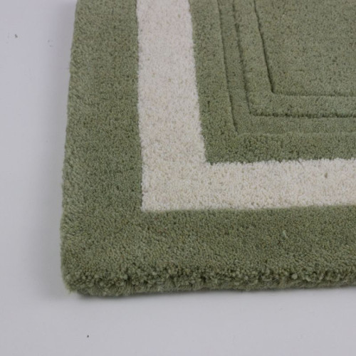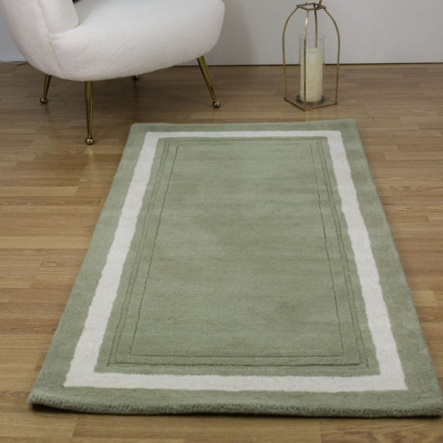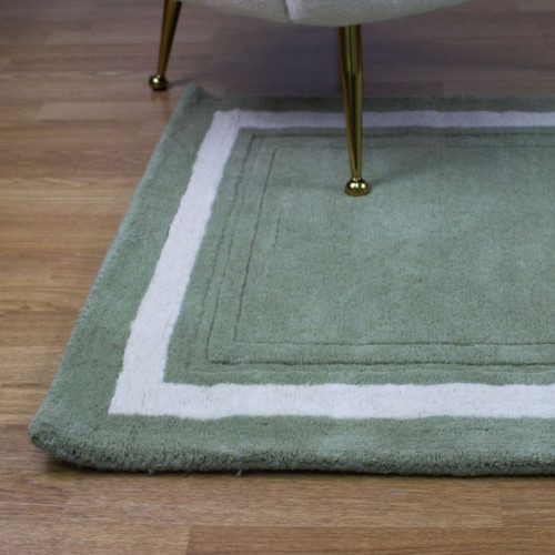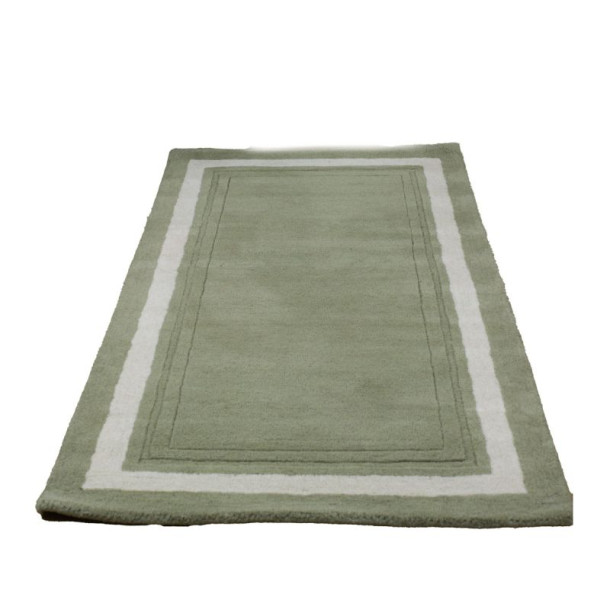 Alfombra de lana natural, de color verde claro, salvia, con diseño clásico de cenefa central contrastada en color neutro.