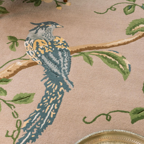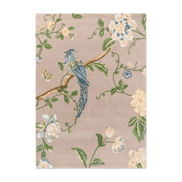 La Alfombra de lana Summer Palace tieneun estampado chinoiserie, con flores y aves del paraiso, muy popular entre los amantes del diseño de Laura Ashley.