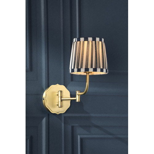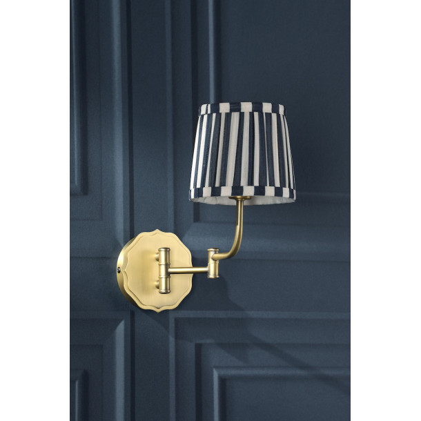 Aplique de pared Laura Ashley Denwick. Pantalla a rayas en tonos azul marino y crema y base de latón antiguo. Ideal para dormitorios, salas de estar o cocinas.