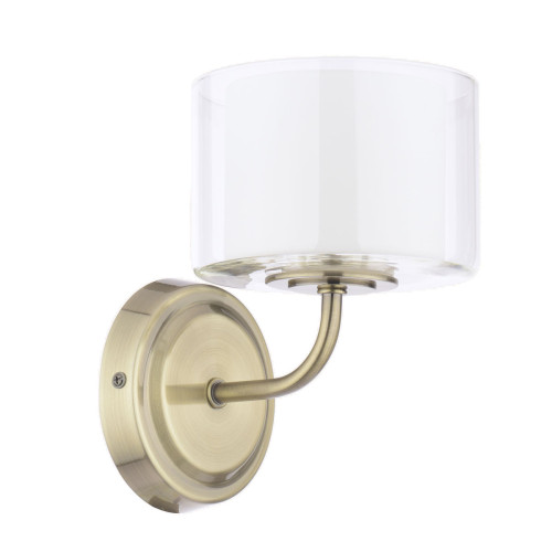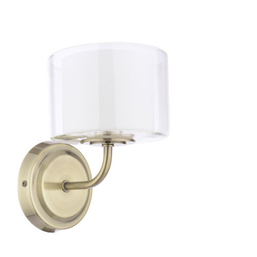 Aplique de pared con doble pantalla, luz cálida y base en latón antiguo. Perfecto para salones y comedores.