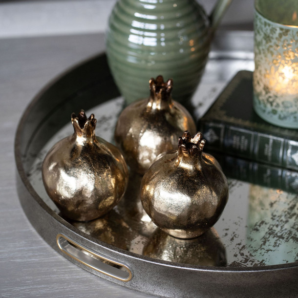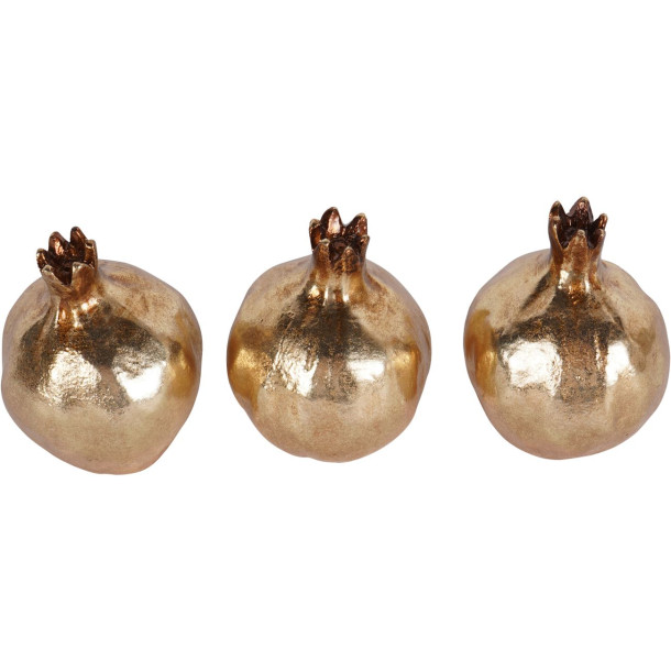 Tres figuras de granadas doradas, perfectas para realzar tu decoración con su precioso acabado dorado.