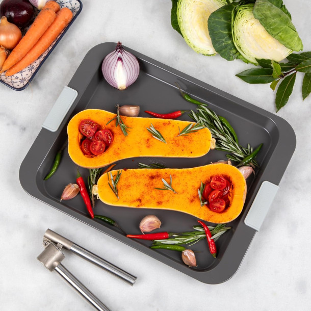 Asas resistentes al calor: nuestra bandeja para horno viene equipada con asas de silicona de fácil agarre resistentes al calor, por lo que es más seguro y conveniente quitar la bandeja del horno, incluso cuando está caliente. Este mango proporciona un agarre cómodo.