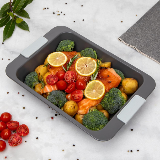 Asas resistentes al calor: nuestra bandeja para horno viene equipada con asas de silicona de fácil agarre resistentes al calor, por lo que es más seguro y conveniente quitar la bandeja del horno, incluso cuando está caliente. Este mango proporciona un agarre cómodo.