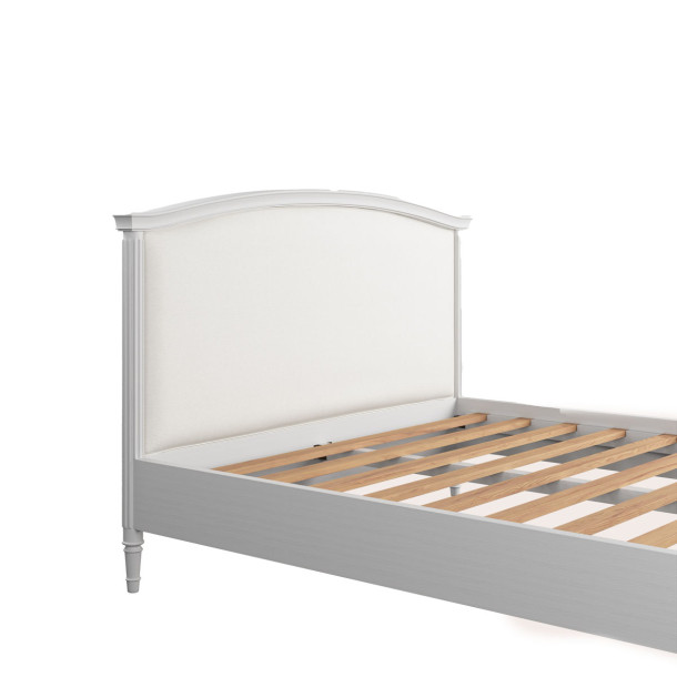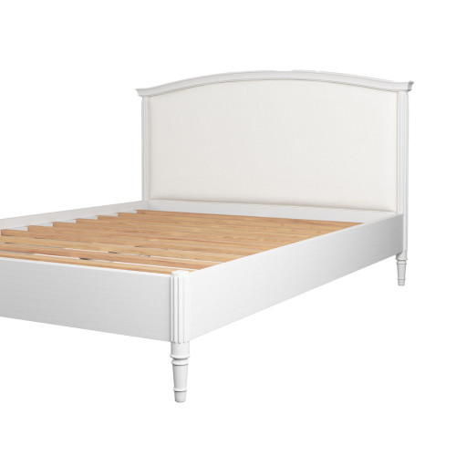 Cama elegante y atemporal, con cabecero tapizado y diseño curvo, en madera blanca lavada con veta sutilmente visible, y tejido natural. De Laura Ashley.