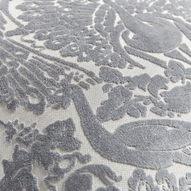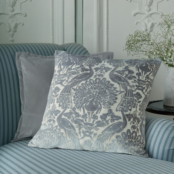 Cojín Peacock con diseño de Pavos Reales en Terciopelo, en tonos Gris Acero. Mide 50cm x 50cm. De Laura Ashley