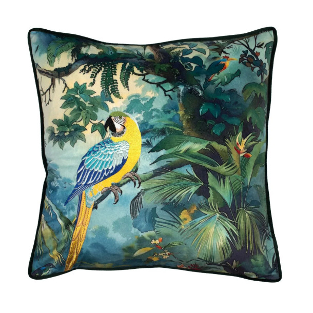 Cojín Popat con diseño de Loro bordado sobre terciopelo, en tonos Verde Azulado. Mide 45 X 45 cm. De Malini.
