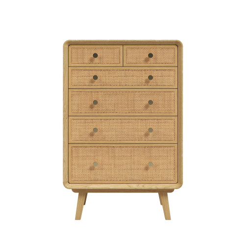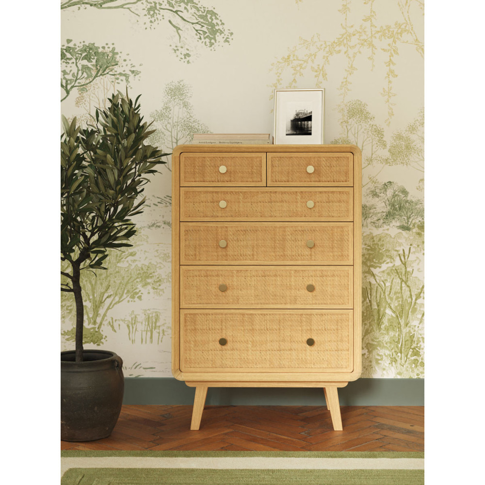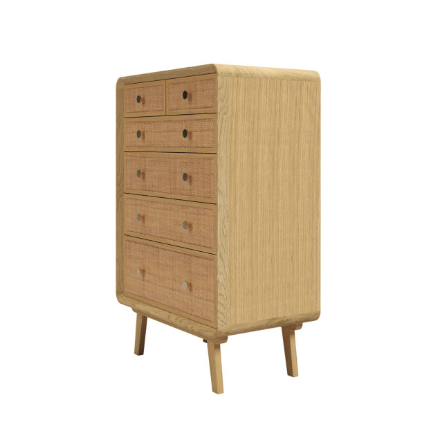 Cómoda Millen, en una combinación de roble y ratán, de 2+4 cajones, está realizada con roble macizo y chapa de roble con frentes de cajones de ratán y herrajes dorados. Esta cómoda tiene 6 cajones que ofrecen mucho espacio para tu ropa.