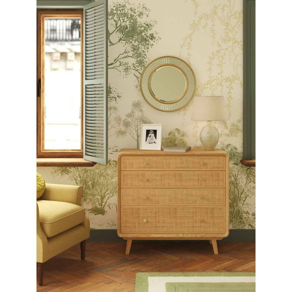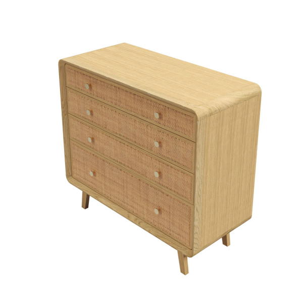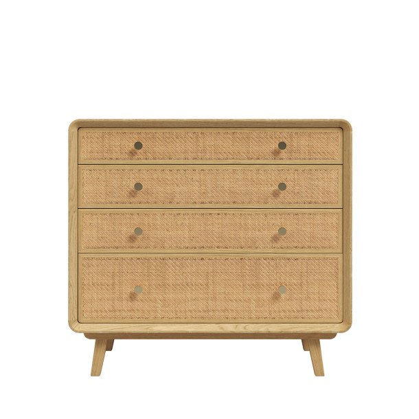 Cómoda Millen, en una combinación de roble y ratán, de 4 cajones, está realizada con roble macizo y chapa de roble con frentes de cajones de ratán y herrajes dorados. Esta cómoda tiene 4 cajones que ofrecen mucho espacio para tu ropa.