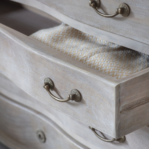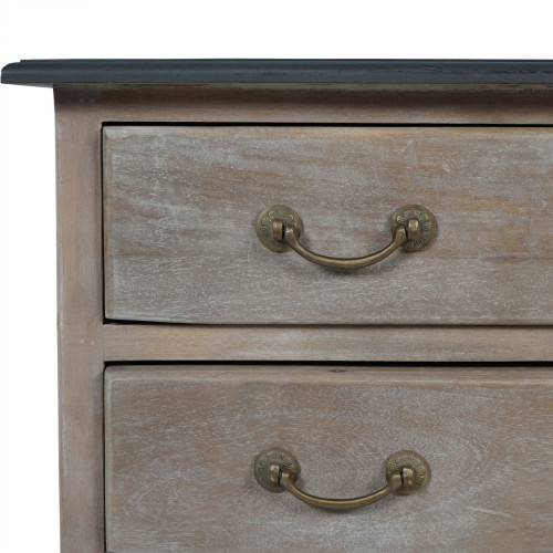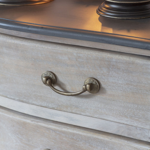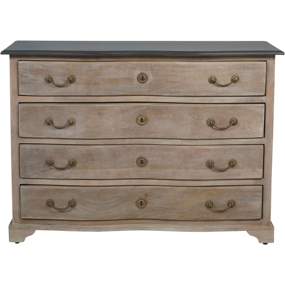 Cómoda de madera natural con 4 cajonescon suaves diseños curvos, combinando cuerpo de madera natural y tapas gris pizarra. Herrajes y cerraduras decorativas en bronce envejecido para un estilo tradicional.