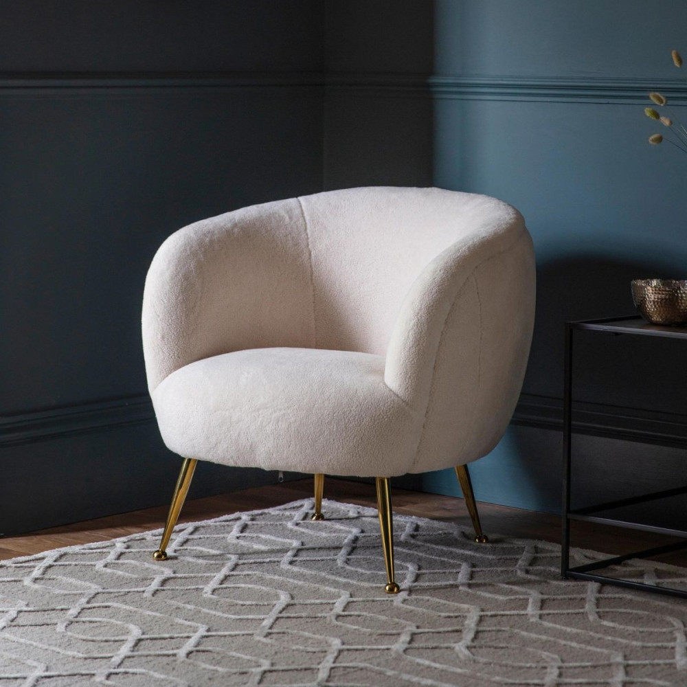 Butaca de diseño con acabado efecto piel de oveja, muy cómoda, que se completa con patas metálicas de acadado dorado, para un estilo único.