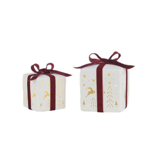 Adornos de Navidad Cerámica Blanca y Roja en Forma de Regalo de Laura Ashley, preiluminado, ideal para crear un ambiente navideño romántico y acogedor. Requiere 3 x LR44 no incluidas. Función temporizador. 90% Cerámica, 8% Poliéster, 2% Plástico.
