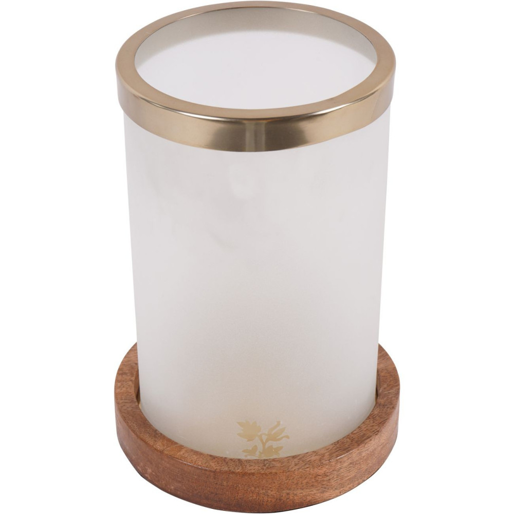 Portavelas cilindro de vidrio blanco esmerilado con zarzas y borde de color dorado.