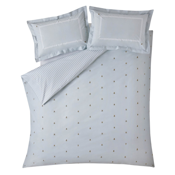 Set de Cama Bees estampado con originales motivos de abejas sobe un suave fondo azul, en 100% Algódon Percale. 200 Hilos. Reverso con Rayas azules.