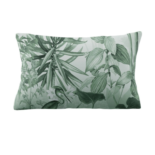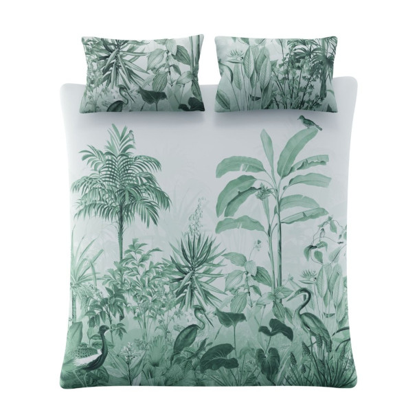 Set de Cama Glasshouse estampado con Una vibrante variedad de aves exóticas y exuberante follaje., en 100% Algódon Percale. 220 Hilos. Impresión digital.. Reverso con Un paisaje verde más sutil y apagado.