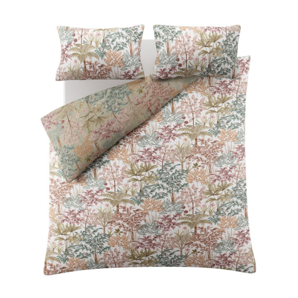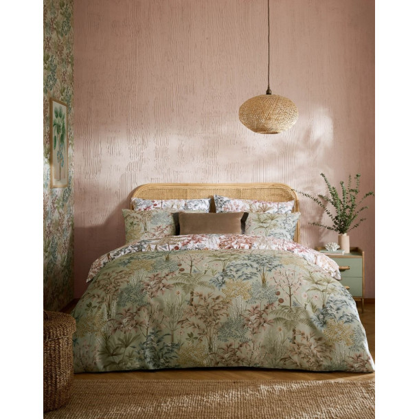 Set de Cama Jardin Botanico estampado con Una sinfonía de follaje de tonos suaves en tonos salvia, rubor y neutros cálidos., en 100% Algódon Percale. 220 Hilos. Impresión digital.. Reverso con refleja el diseño en un tono más discreto y apagado.