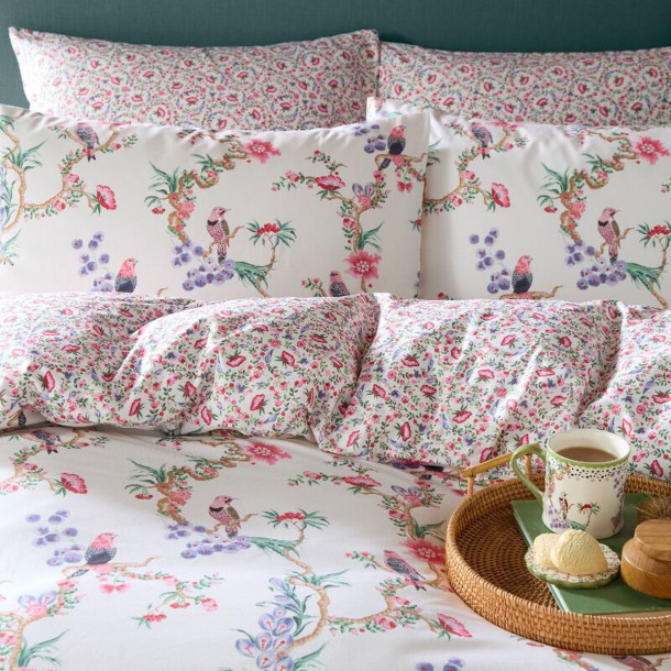 Una nueva versión de un clásico de Cath Kidston. Pájaros pintados a mano se posan entre ramas floridas en tonos joya suaves. Impreso sobre percal de algodón 100% de 180 hilos, con reverso de flores pequeñas para un acabado armonioso.