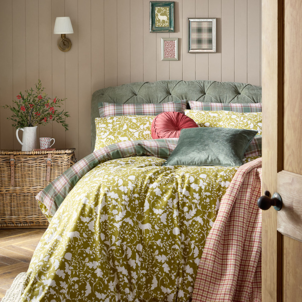 Set de Funda Nórdica con flores, hojas y ciervos en estilo arts & crafts. Tonos suaves y textura cálida para un dormitorio acogedor y romántico.