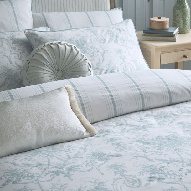Set de Funda Nórdica con estampado clásico francés en azul. Diseño elegante y romántico sobre algodón satén, ideal para ambientes sofisticados.