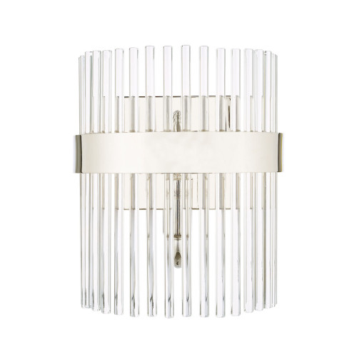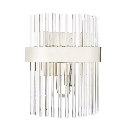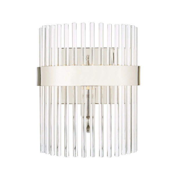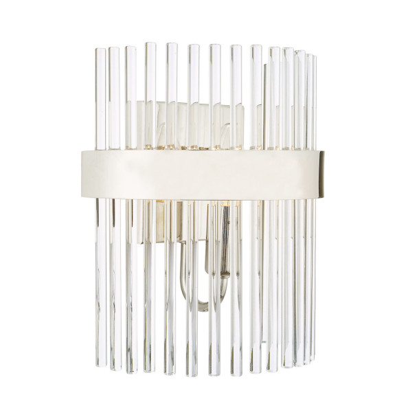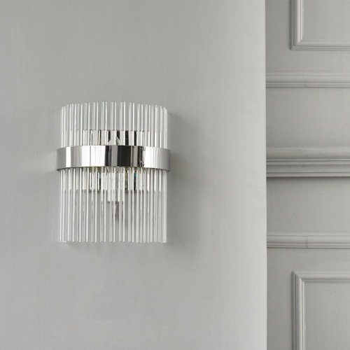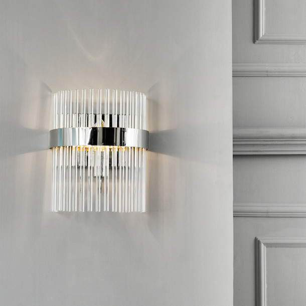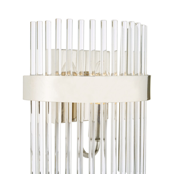 Aplique de pared con varillas de cristal y base en níquel, mezcla de estilo clásico y moderno. Ideal para entradas y pasillos.