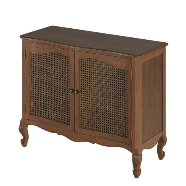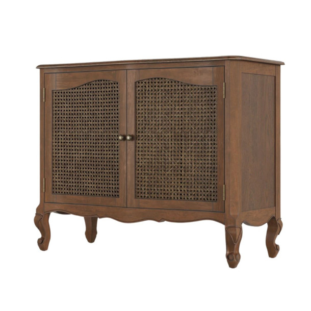 Sus elegantes puertas están revestidas con paneles de caña de ratán y tiradores de latón antiguo, que ocultan un amplio espacio de almacenamiento con un estante ajustable.