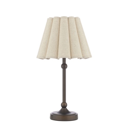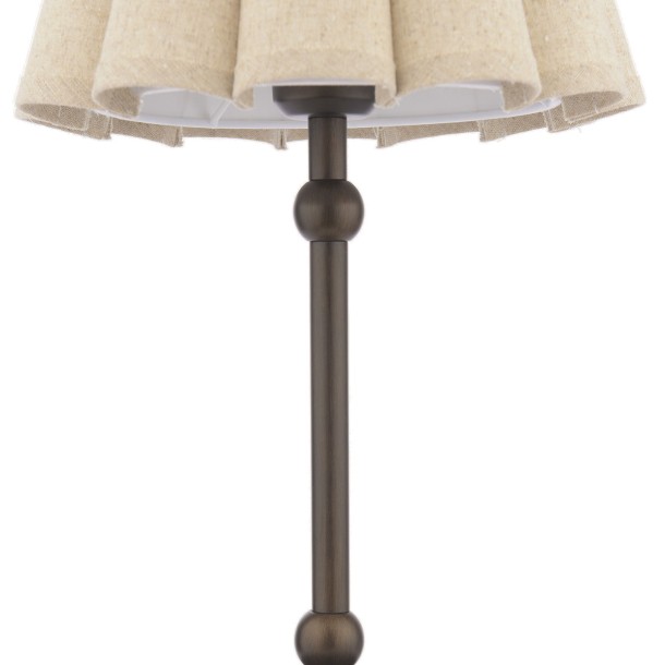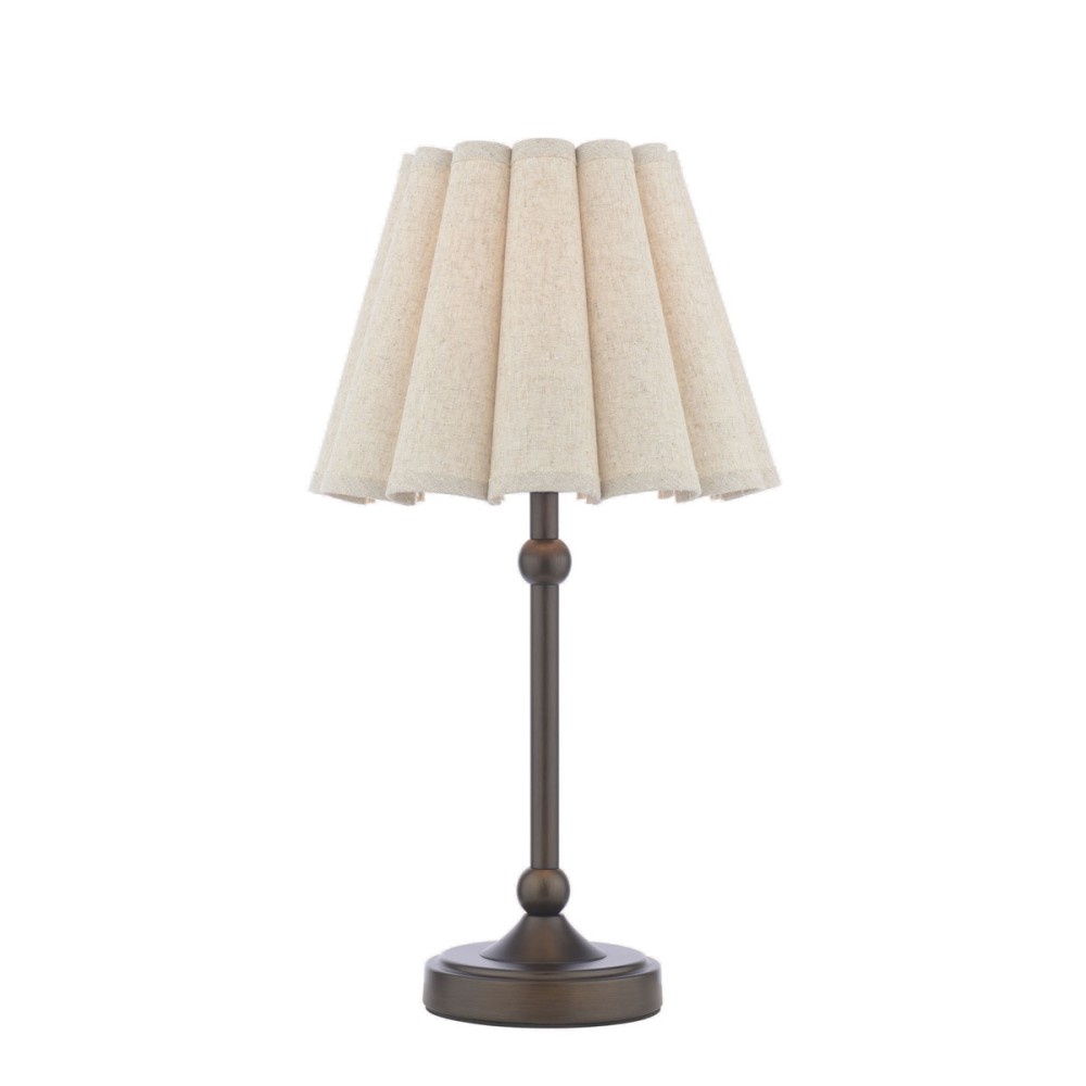 Lámpara de mesa HOLWELL en bronce antiguo con pantalla de lino. Su luz cálida y acogedora transforma mesillas o consolas en rincones con estilo. Una pieza versátil y con aire vintage que aporta sofisticación sin esfuerzo a cualquier espacio de tu casa.