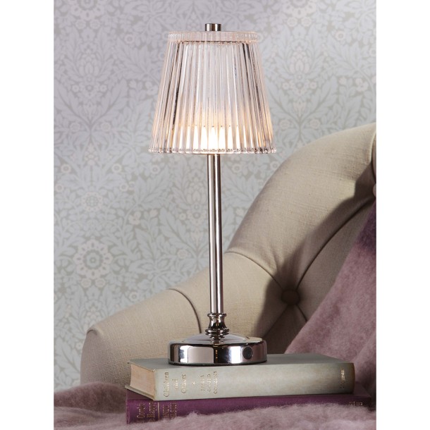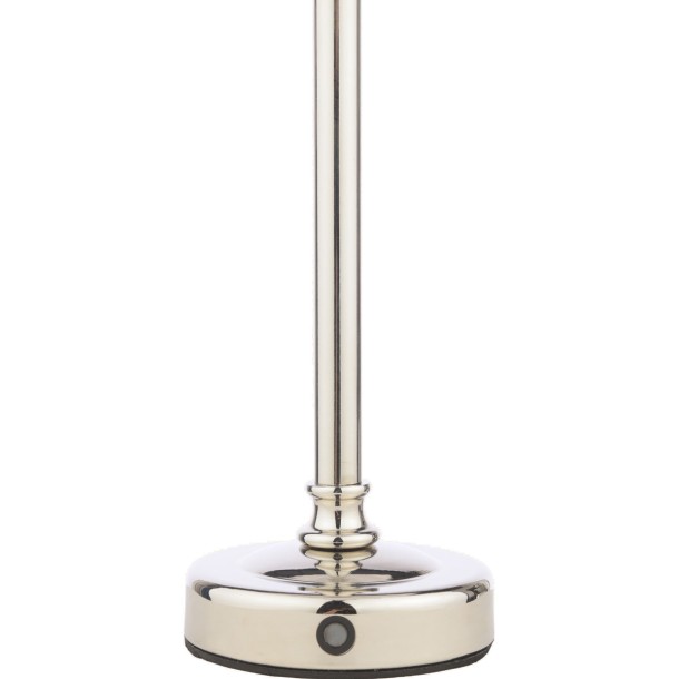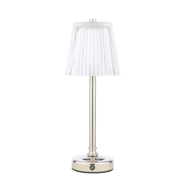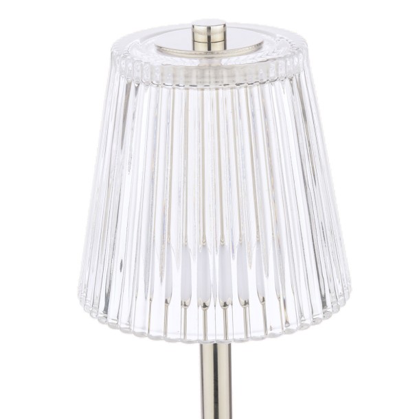 La lámpara de mesa CALLAGHAN recargable, en níquel pulido y con pantalla de cristal, aporta luz cálida sin cables. Perfecta para mesas auxiliares, consolas o dormitorios, combina practicidad, diseño y estilo contemporáneo.