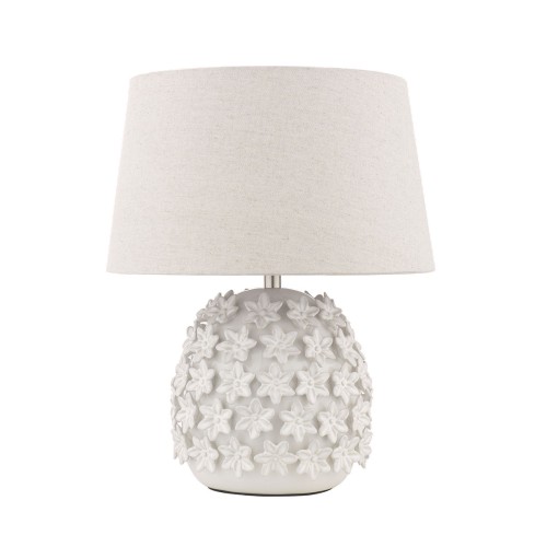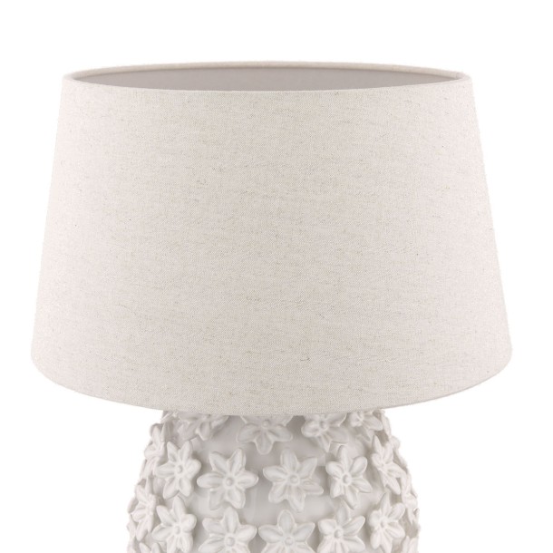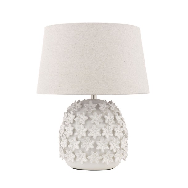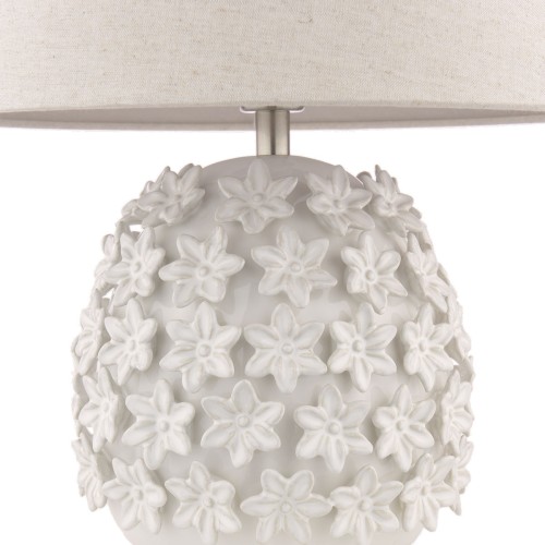La lámpara INGHAM en cerámica blanca con estampado floral y pantalla clara añade luz suave y encanto clásico. Perfecta para consolas, dormitorios o recibidores.