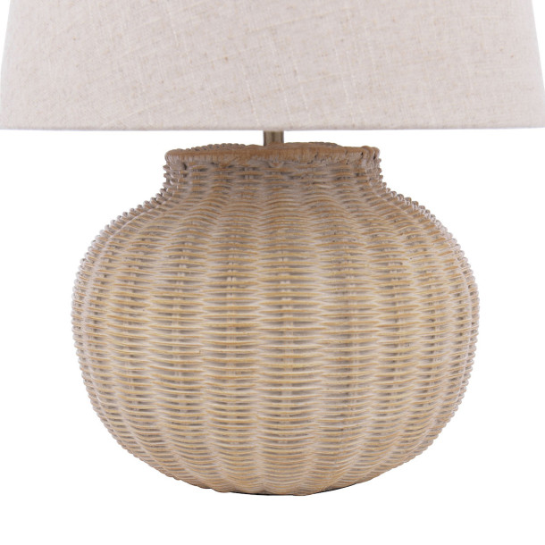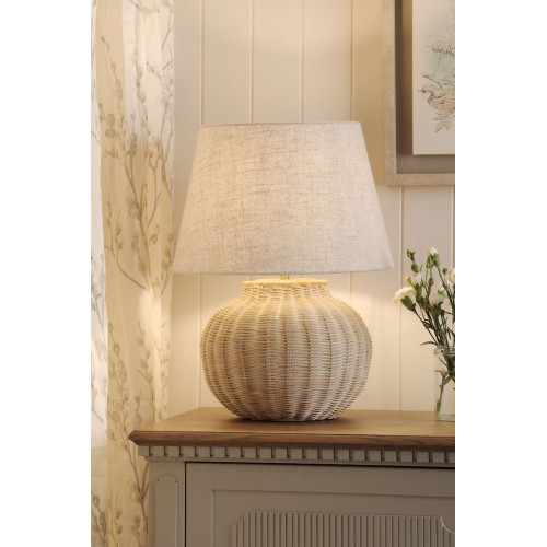Lámpara de mesa grande Laura Ashley Fernhill. Base de efecto ratán tejido y pantalla de lino en color avena. Proyecta un resplandor cálido y acogedor, añadiendo sofisticación a cualquier habitación.