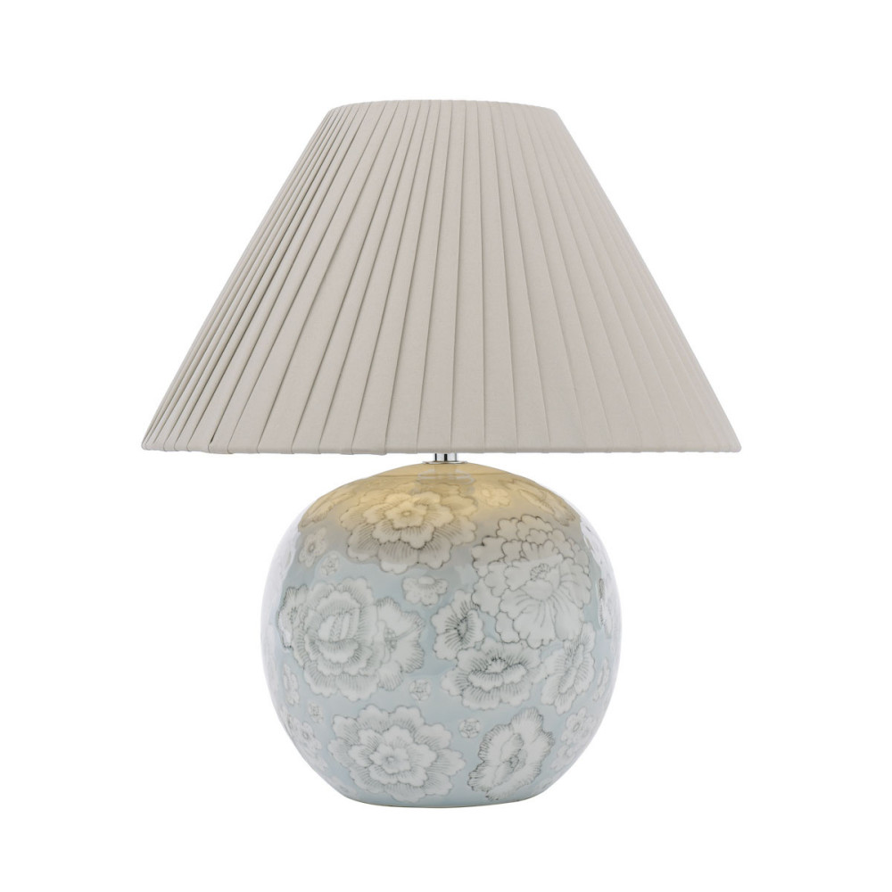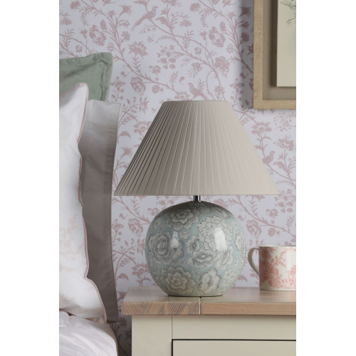 Lámpara de mesa Laura Ashley Montford. Base redonda de cerámica con patrón floral azul. Ideal para mesas auxiliares en la sala de estar o mesitas de noche en el dormitorio, añadiendo un toque de color.