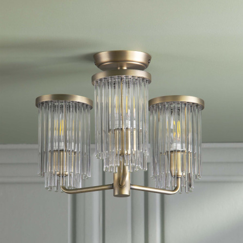 Lámpara semiempotrada con acabado en latón envejecido mate y varillas de vidrio. Ideal para dormitorios con techos bajos.