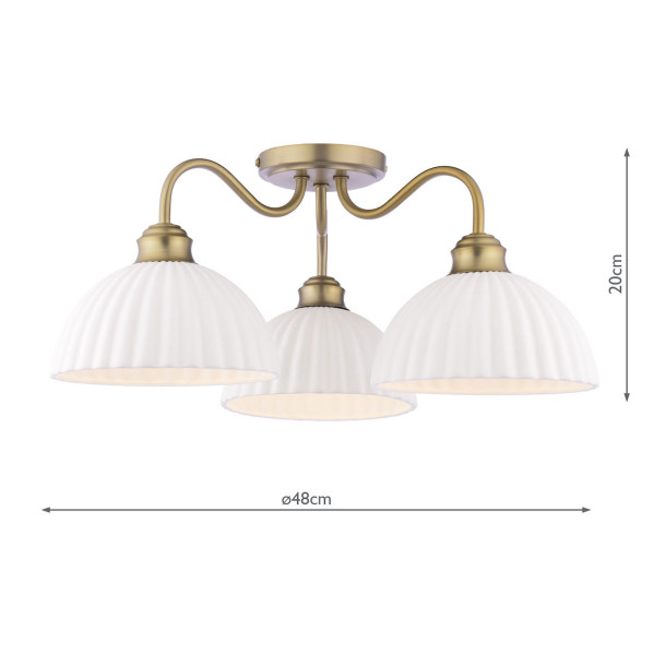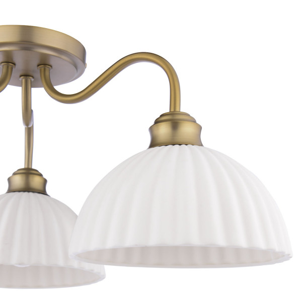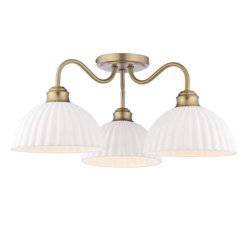Lámpara de techo semi-plafón Laura Ashley Durford de 3 luces. Acabado en latón antiguo mate y pantallas de porcelana. Ideal para salas de estar o dormitorios con techos bajos, aportando calidez y sofisticación.