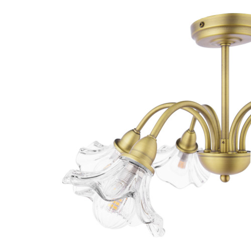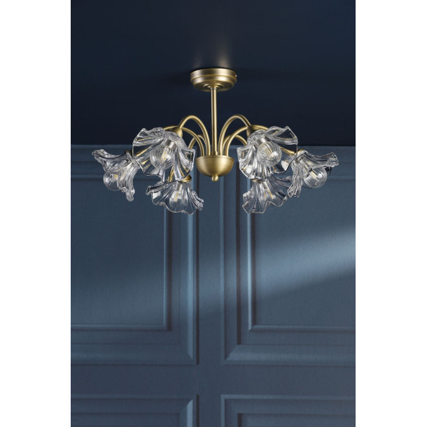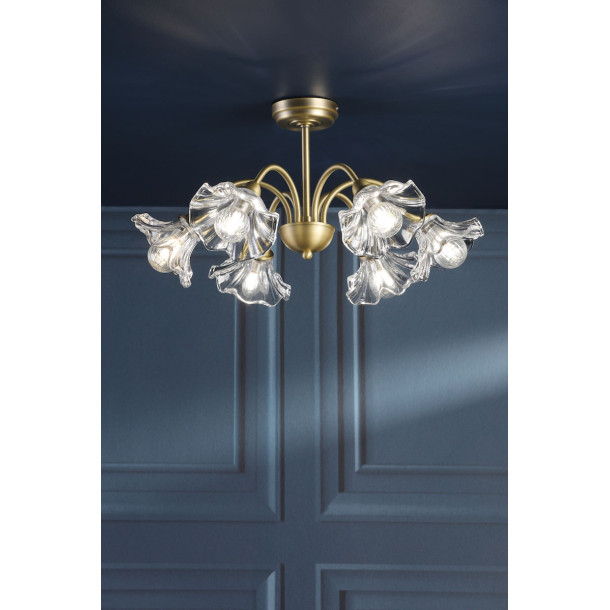 Lámpara de techo semi-plafón Laura Ashley Kerswell de 6 luces. Pantallas de vidrio en forma de flor y acabado en latón antiguo mate. Perfecta para salas de estar o dormitorios, creando un ambiente acogedor.