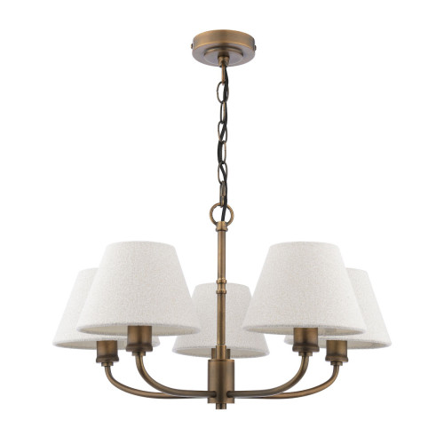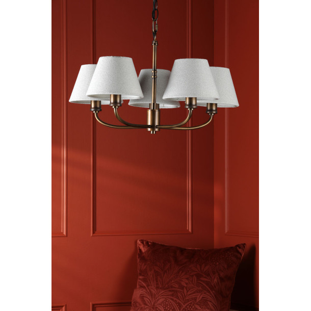 Lámpara de araña Laura Ashley Denston de 5 luces. Pantallas de tela boucle en algodón crema y acabado en bronce antiguo. Altura ajustable para personalizar cualquier espacio.