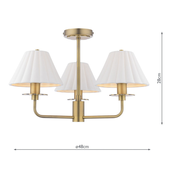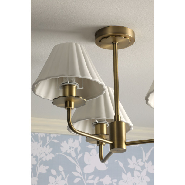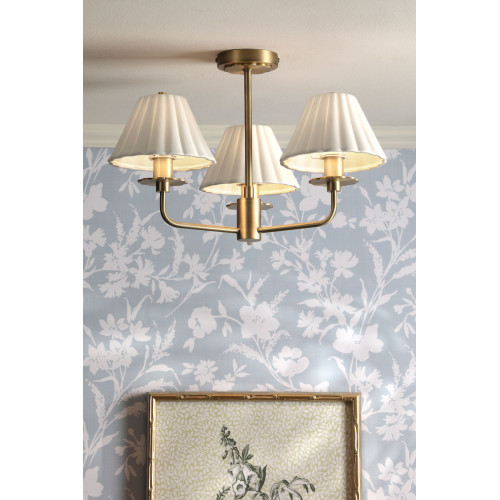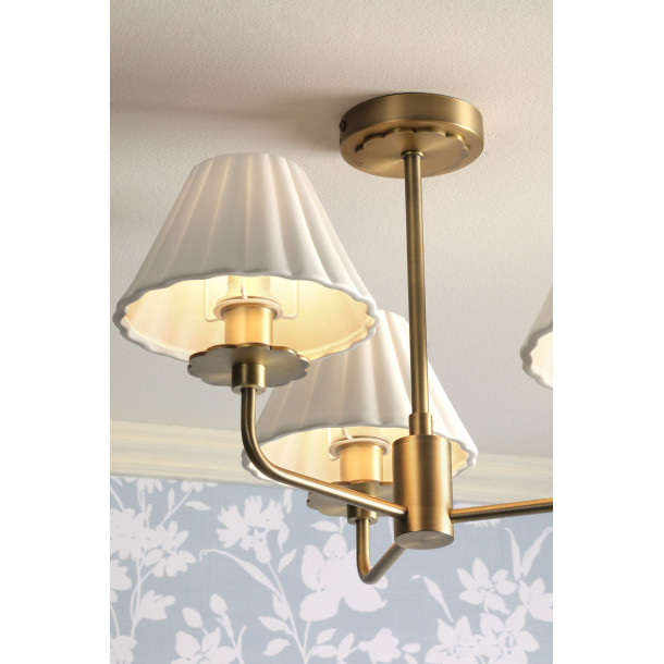 Lámpara de techo semi-plafón Laura Ashley de 3 luces. Acabado en latón antiguo y pantallas de porcelana acanaladas. Perfecta para el dormitorio o la sala de estar, combinando herencia y estilo moderno.
