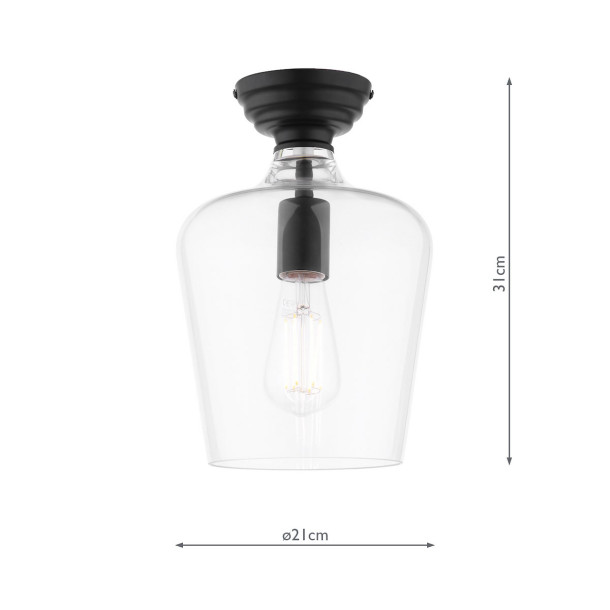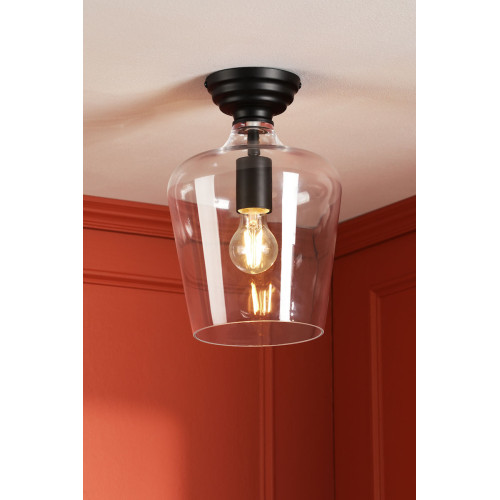 Lámpara de techo semi-plafón Laura Ashley Ockley. Acabado negro y pantalla de vidrio transparente. Perfecta para salas de estar, dormitorios y cocinas con techos bajos.