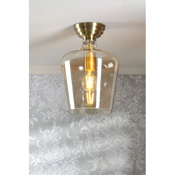 Lámpara de techo semi-plafón Laura Ashley Ockley. Acabado en latón antiguo y pantalla de vidrio transparente. Ideal para salas de estar, dormitorios y cocinas con techos bajos.