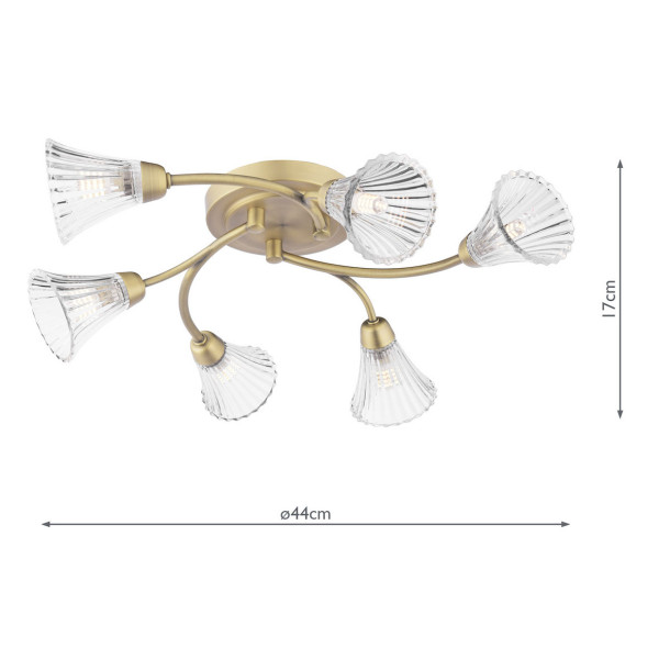 Lámpara de techo semi-plafón Laura Ashley Lanton de 6 luces. Acabado en latón antiguo mate y pantallas de vidrio acanalado. Añade un toque de encanto vintage a cualquier habitación.
