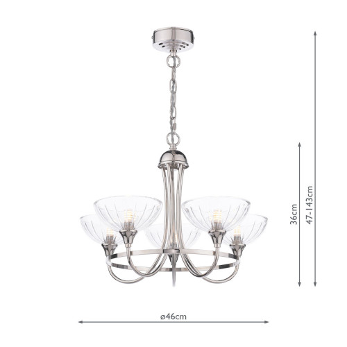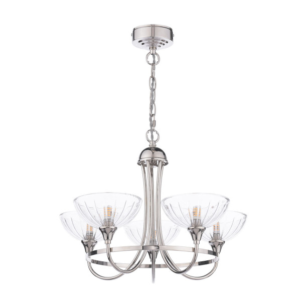 Lámpara de techo de 5 brazos Laura Ashley Wellham. Acabado en níquel pulido y pantallas de vidrio tallado. Altura ajustable para personalizar el ambiente, creando un resplandor íntimo o un efecto dramático.