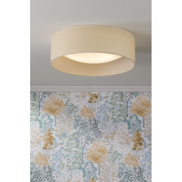 Lámpara de techo plafón Laura Ashley Buckenham de 2 luces. Material de efecto ratán tejido. Perfecta para techos bajos, proyectando una luz natural y suave en espacios más pequeños e íntimos.