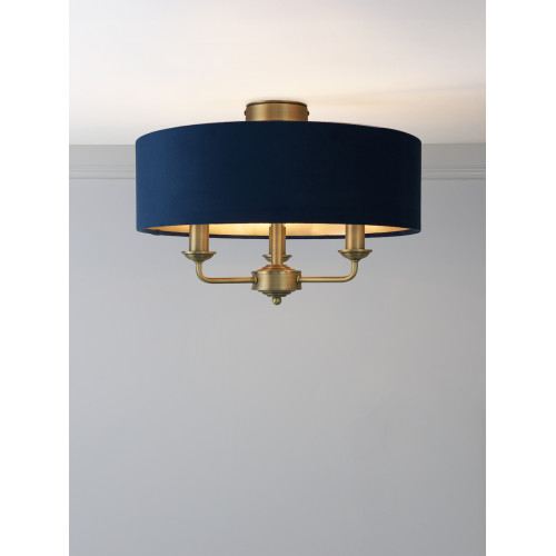 Lámpara de techo Plafón Sorrento de 3 luces, latón antiguo mate y pantalla azul, Laura Ashley