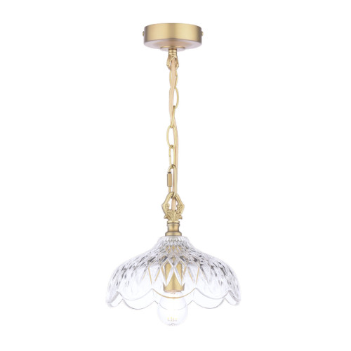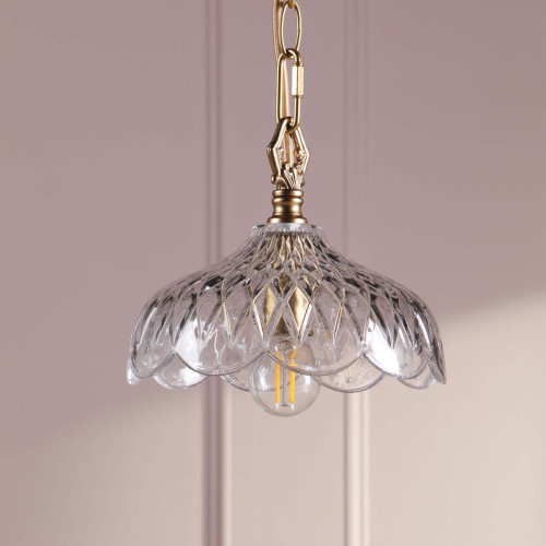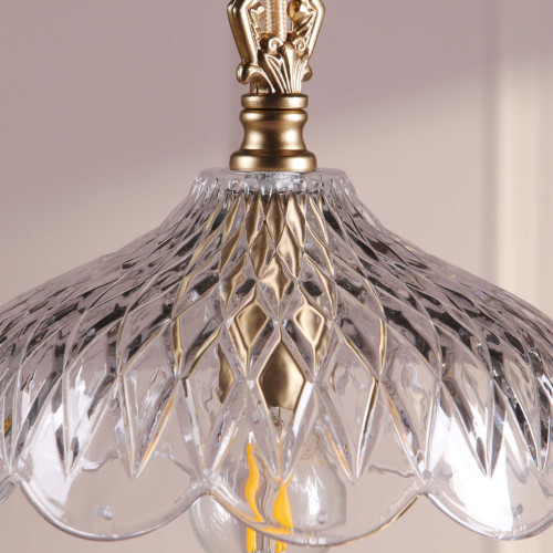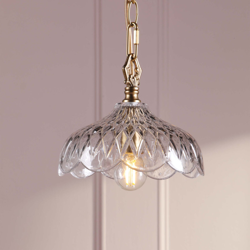Lámpara colgante con acabado en bronce antiguo y cristal tallado. Perfecta para pasillos y cocinas con encanto vintage.