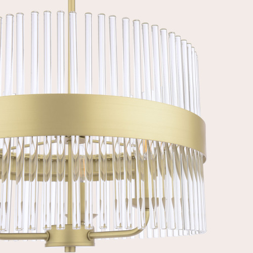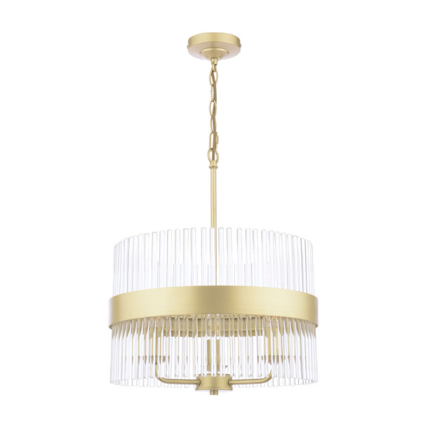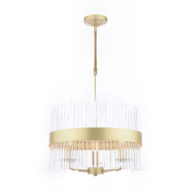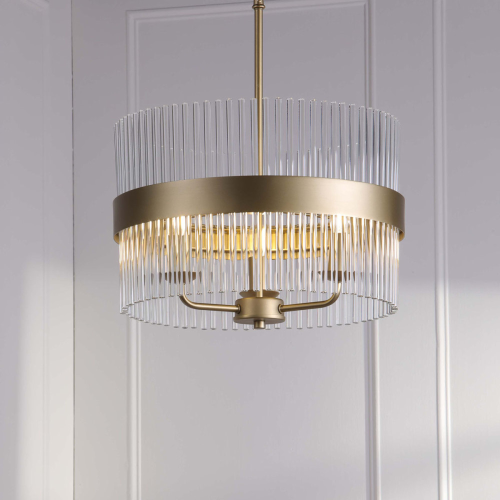 Lámpara colgante con tres luces, acabado en latón envejecido y varillas de vidrio. Perfecta para dormitorios con estilo retro.