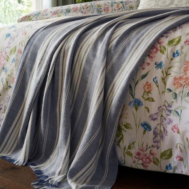 Manta Ardley con diseño de Rayas, en tonos Azul Mar. Mide 130cm x 170cm. De Laura Ashley